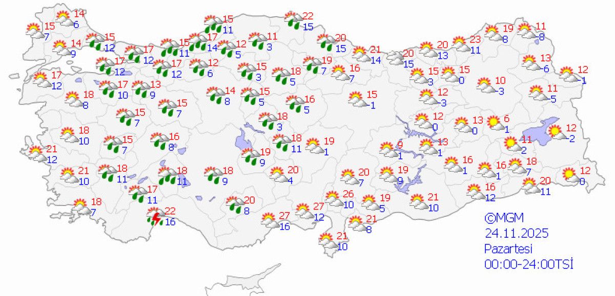 Yurt genelinin parçalı bulutlu geçeceği, Marmara’nın doğusu, İç Ege, Batı Akdeniz, İç Anadolu’nun büyük kısmı, Batı Karadeniz ile Samsun, Amasya, Çorum ve Mersin’in batı ilçelerinde sağanak ve yer yer gök gürültülü sağanak yağış bekleniyor.